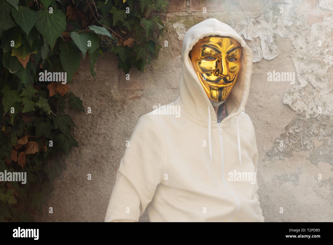 Velvary Czech Republic Feb 27 2019 Unidentified Man Wearing Vendetta Mask As Computer Hacker And Standing In Front Of Grungy Wall With Smoke Stock Photo Alamy